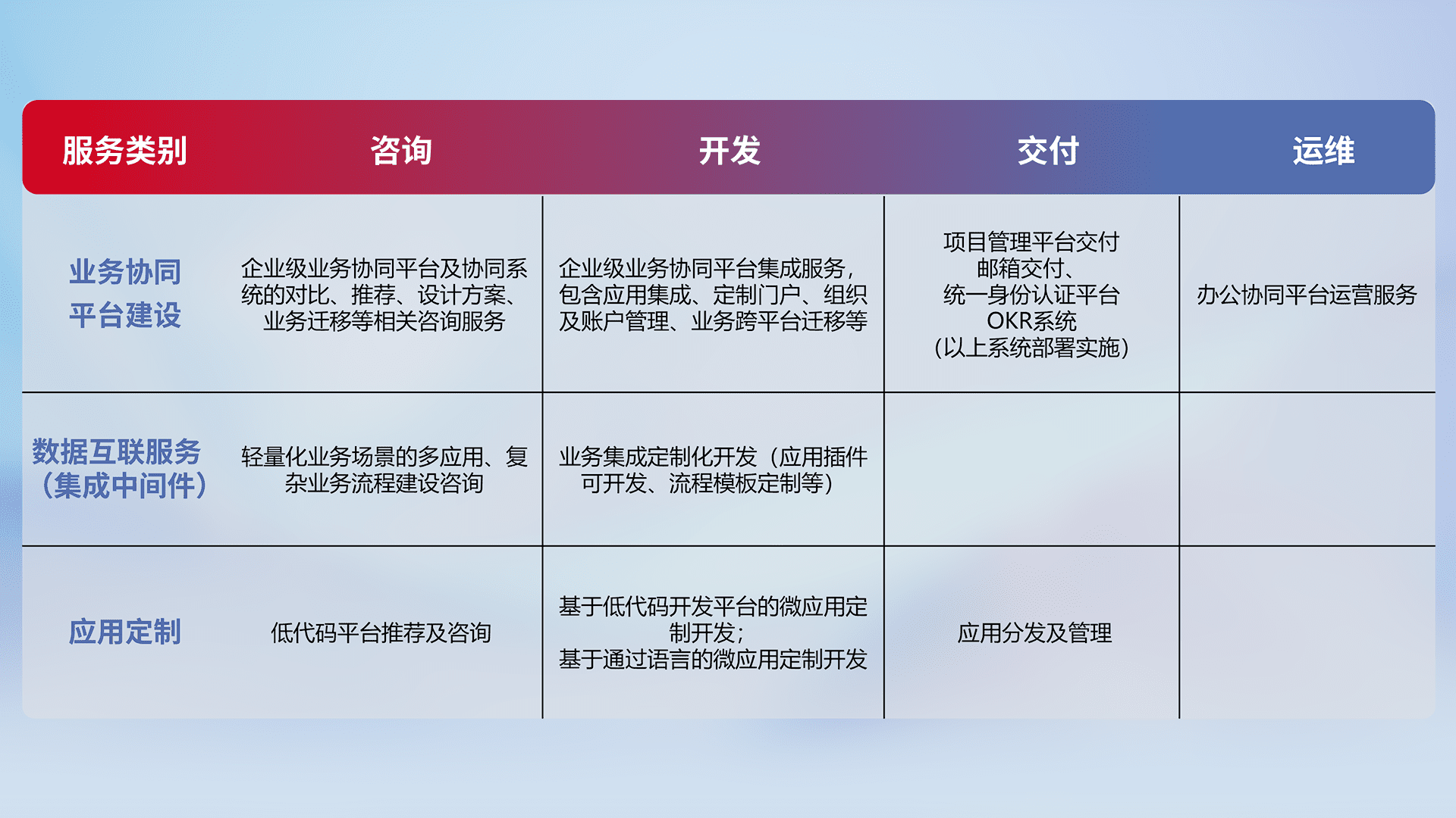 针对钉钉、、、、企微、、、IDaas等平台级产品提供产品的规划、、、方案、、、、交付、、、定制化开发等服务,,,,实现如统一协同办公、、、智能客户服务、、混合会议管理、、、智能数据查询、、等业务场景,,,,实现数字化转型。。。
