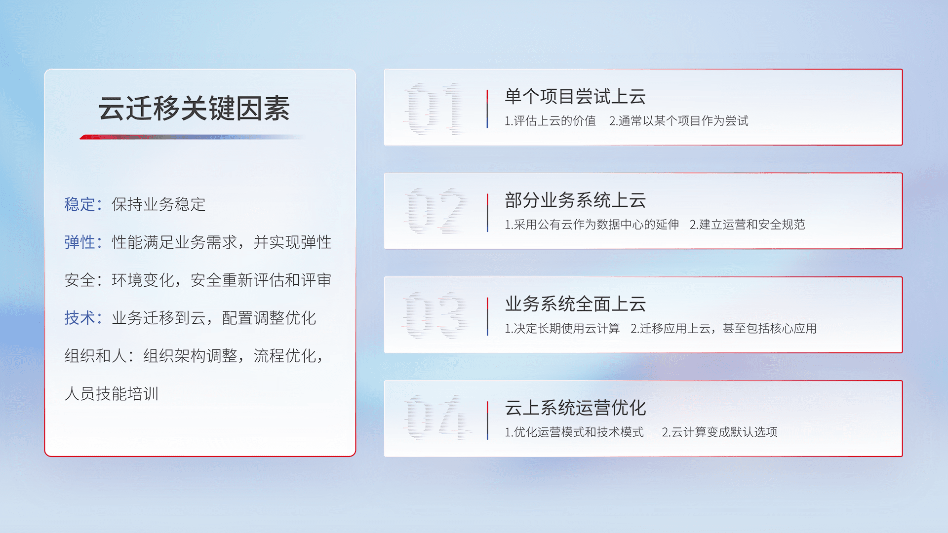 结合实际业务,,,从规划设计、、、云平台选型、、、云原生改造、、、、数据迁移、、、、集成交付,,,,迁移全过程为客户识别最佳上云路径,,,,做好风险识别管理,,,,设计网络架构、、、身份权限、、、、安全审计合规、、、操作审计、、、、日志审计、、监控告警策略、、、多站点容灾设计等,,对云上基础设施进行整体规划,,,提升IT治理水平,,以满足弹性、、、、高可用、、高性能的需求。。。