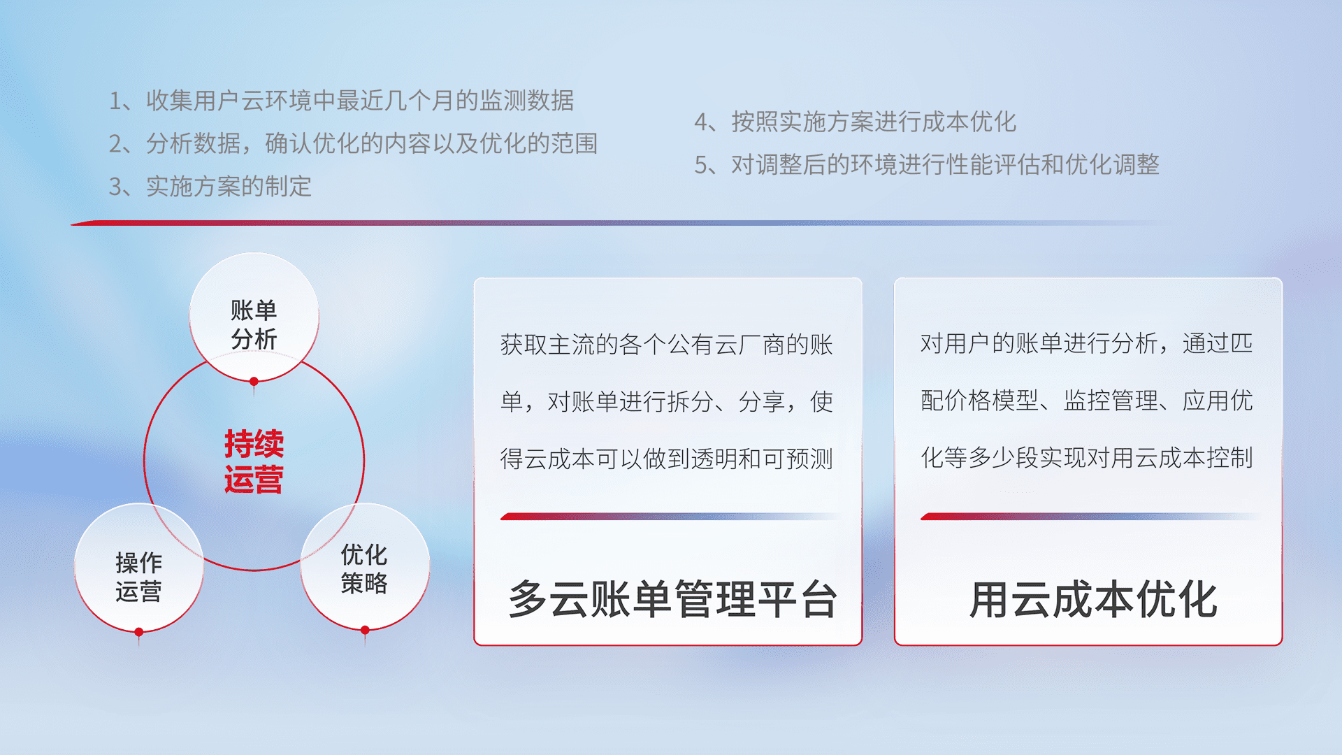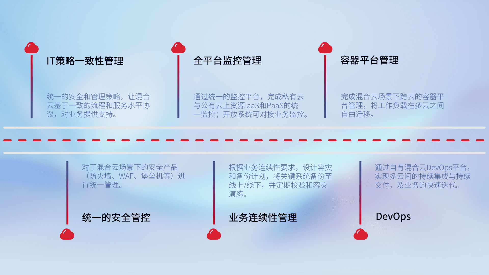 通过多云纳管,,以统一的资源数据模型把客户的云资源进行抽象和封装,,,,进而实现对多云资源的统一操作,,保障云资源管理的可靠性、、、、稳定性与可用性。。。。量身定制化运维内容,,,配置、、、、开发运维、、、、补丁管理、、备份、、、监控、、、、认证和访问管理、、、、审计和日常巡检等,,,保障在用云过程中的可靠度,,稳定度以及高可用率。。。。
